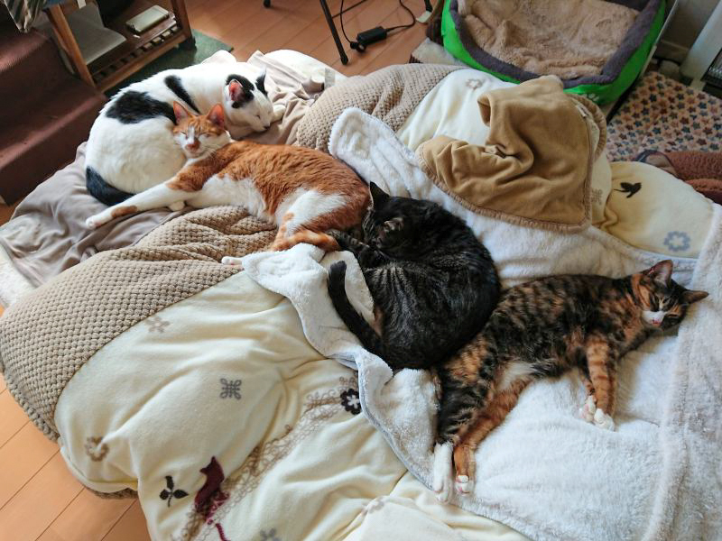 昼間はみんな一緒にお布団にいられるけど夜は寒いから下の部屋でストーブをつけてみんなで一緒に過ごす