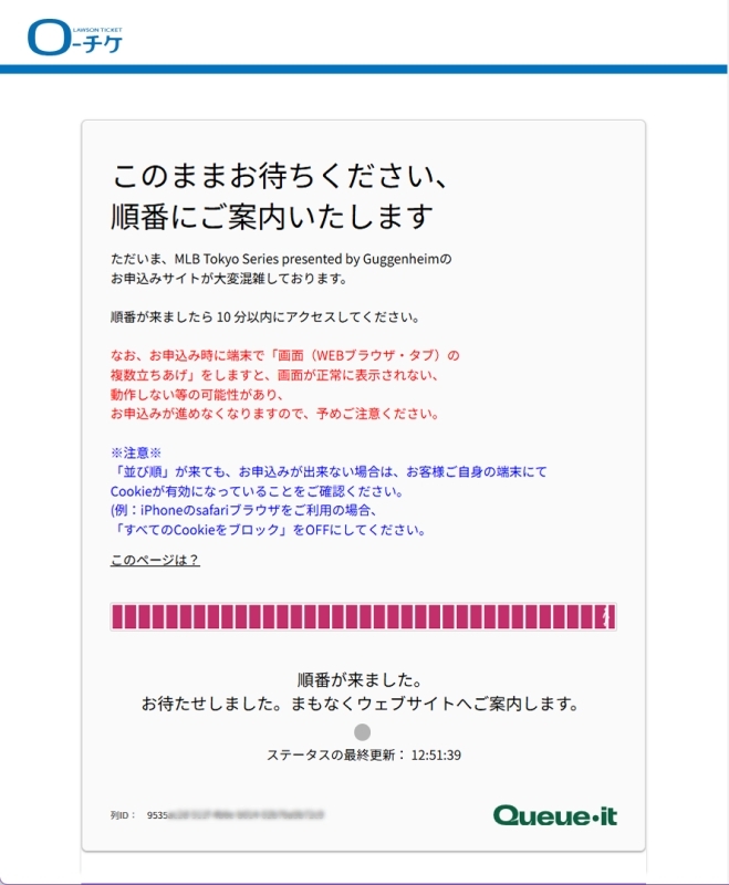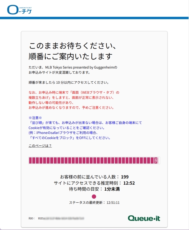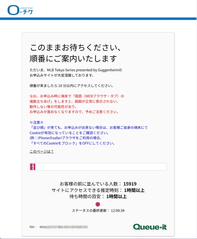 MLB Tokyo Series presented by Guggenheim ローチケHMVプレミアム先行抽選受付が14日午後0時から始まった 12時すぐにサイトを開いたら順番待ちの案内が表示されて この時点で 15,919人が順番待ち 申込みのサイトにアクセスできるまでの待ち時間は1時間以上とのこと 画面をそのまま放置して約50分後 やっとサイトにアクセスできた 申し込みの結果は抽選だから別に待つ必要はなかったけど.. なんかワクワクの50分 全日程の申し込みをしてみたけど、どれかひとつでも当選するといいな.. 新年年明けの運試し 2025-01-14