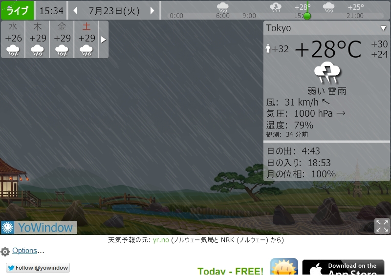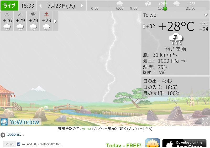 いつも見ている「YoWindow」というリアルタイム天気予報のスクリーンセーバー。 ここのページでも右サイドにウィジェットを置かせてもらって、現在の天気予報を表示している。 東京や地元の位置指定ができて、わりと現在の天気予報にマッチしていて、きれいな動画像でお気に入り。 それが、今日のこのゲリラ豪雨の最中、PCモニタがピカピカしてるからなにかと思ったら、このスクリーンセーバーの中の動画像でも同様に雷が!! もちろん、実際の雷とシンクロしているわけじゃないけど、「雷雨」だということが一目瞭然。 その一瞬をキャプチャ成功! すごいなぁ~ よくできてる! 今日のページに戻る 2013-07-23